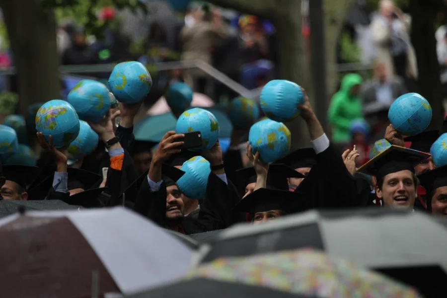 K-School graduates wave their globes. Photo by Lauren A. Sierra/The Harvard Crimson.